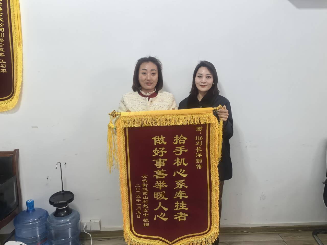 第一面錦旗由市民趙女士贈送。趙女士提到,上周她乘坐公交車時,不慎將手機遺落在西山村委會附近,116路駕駛員劉長洋在行駛至西山村委會時發(fā)現(xiàn)了這部手機,并設法歸還。為了表達感激之情,趙女士特意制作了一面錦旗,上面寫著“拾手機心系牽掛者,做好事善舉暖人心”。